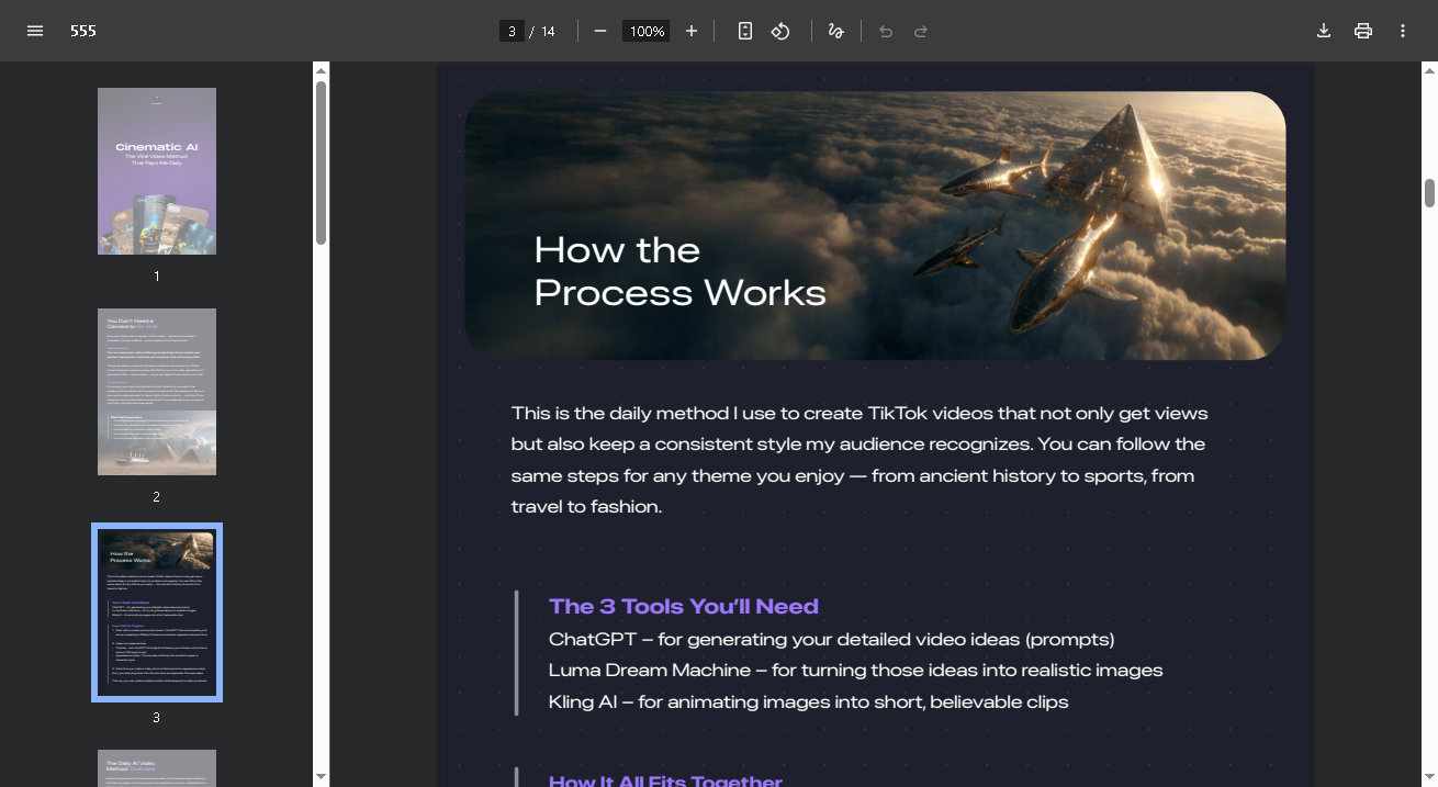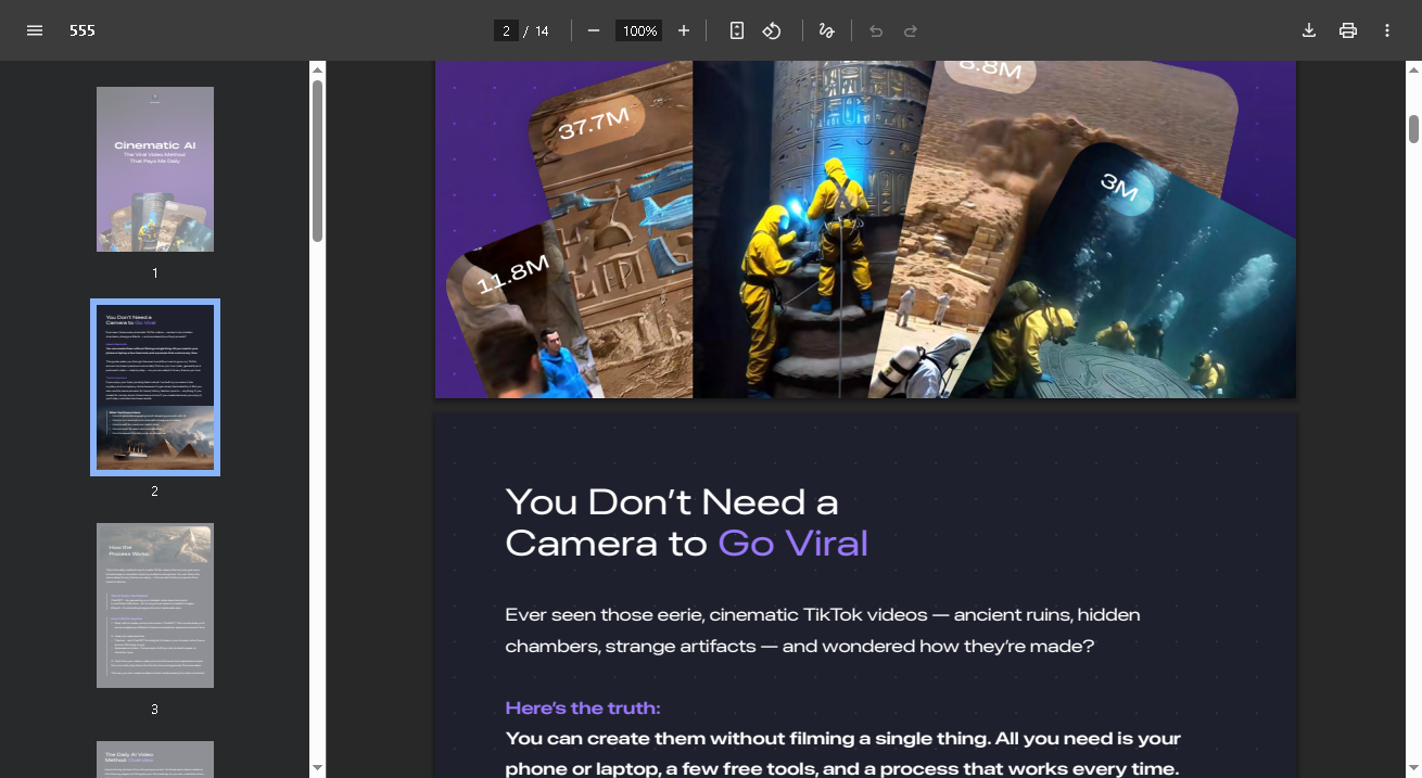 内容很干的一份PDF文件,爆款视频实操指南,一套 “无需拍摄、纯靠 AI 工具” 制作 cinematic(电影感)短视频的流程,帮助创作者实现账号涨粉与每日被动收入。文件不仅包含具体工具用法和步骤拆解,还融入了作者的实战经验,整体偏向 “可直接落地的行动手册”,而非理论性内容。