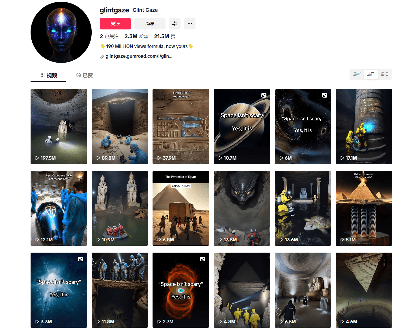 这个tiktok账户一年多的时间获得了200多玩粉丝,单条视频观看超过1.9亿,观看过百万的视频也有几十个。 视频全部都是由AI打造的,作者自己做了一个教程。可以对照他的账户模仿学习。