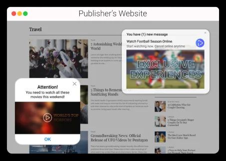 - 弹出窗口广告:这是一种通用的广告形式,会在用户窗口后面弹出。优点是用户不会错过,也不会觉得烦,只有在用户完成浏览器中的操作后才会看到。