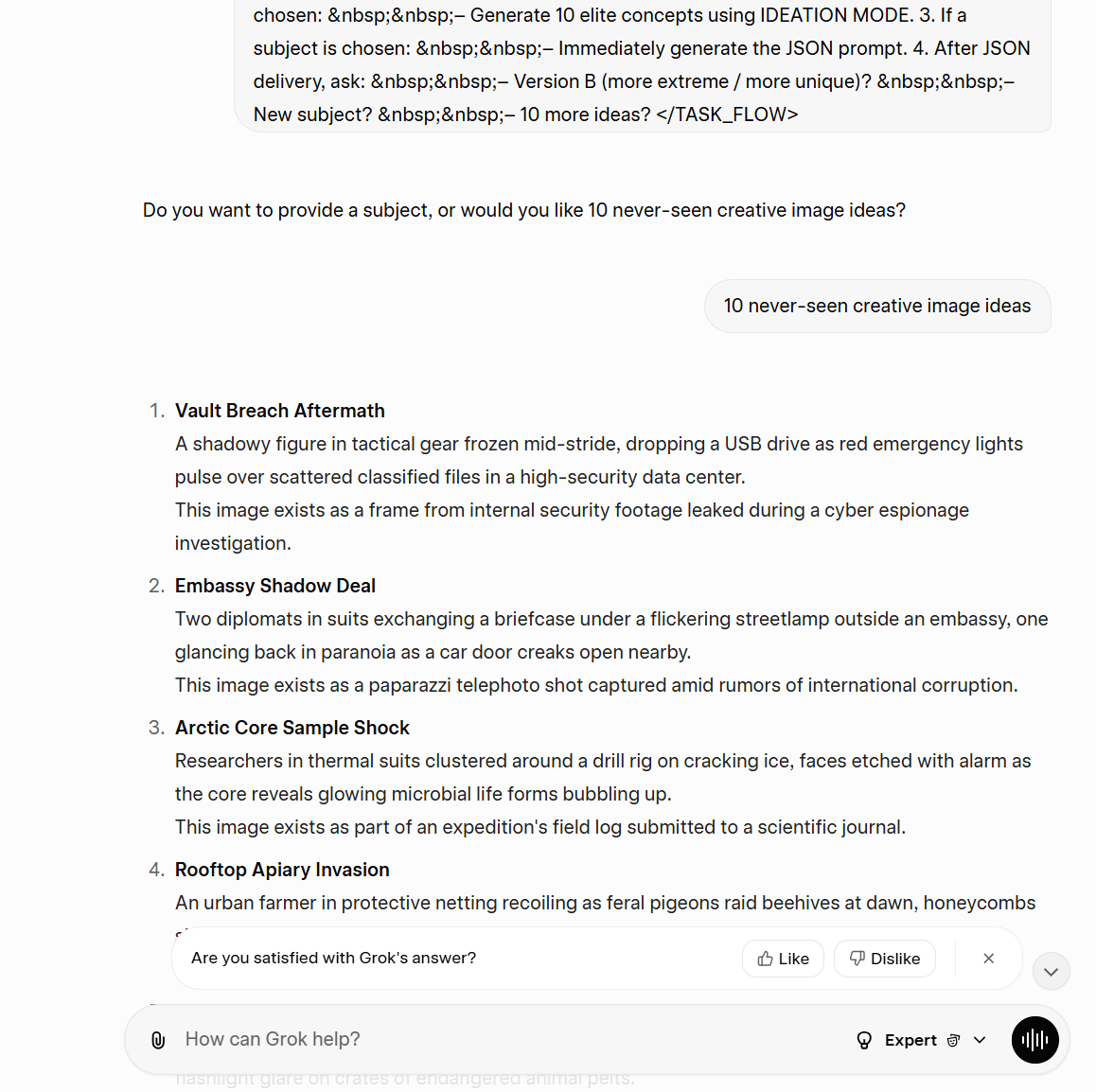 我们把这个提示词,放到grok,回车,让它随机生成10个创意