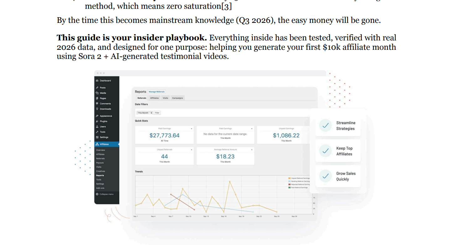 - 核心体系:提出2026 年联盟营销三支柱盈利体系,即 Sora 2 生成真实 UGC 内容、真实证言框架、高客单价赛道选择 + 联盟网络杠杆。