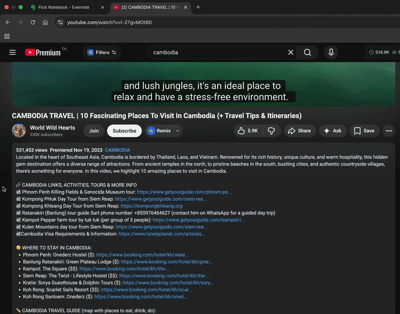 我之前提过Shopify,不管用户花多少钱,你都能拿150美元,很多公司愿意花固定成本获客,因为用户的长期生命周期价值远高于他们付出的佣金。你推广的时候也可以混合不同类型的产品和服务,比如下面一个柬埔寨旅行的视频,视频简介里放了很多链接,虽然我觉得他们放得有点太多了,但确实有用。