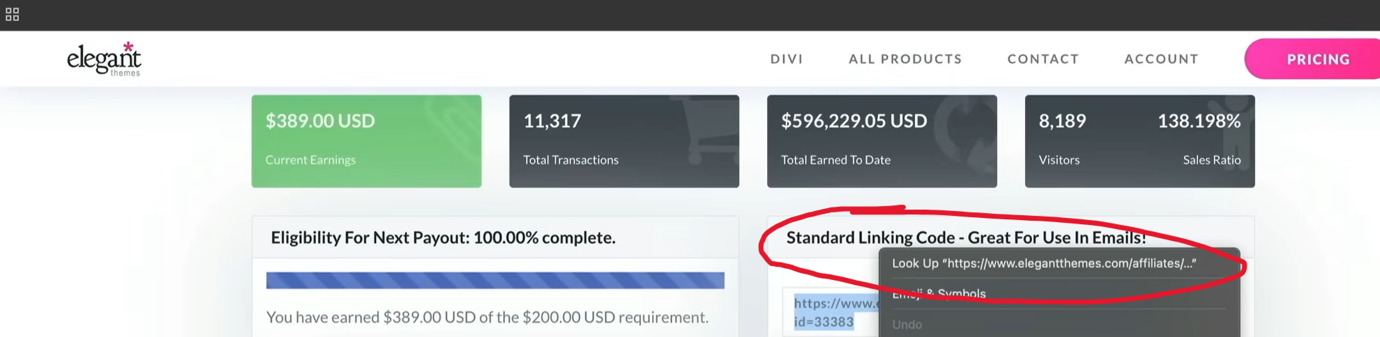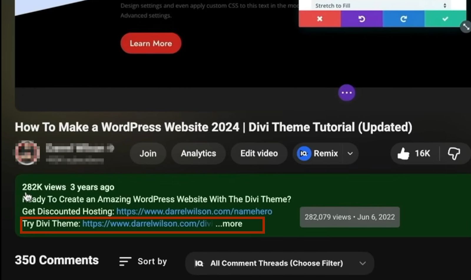 比如3年前发的一个教程视频,现在已经有28.2万次播放了,视频简介里就放了我的推广链接,用户要跟着教程做,就得点链接买Divi主题,跳转到Elegant Themes的网站下单,我就能拿到佣金。