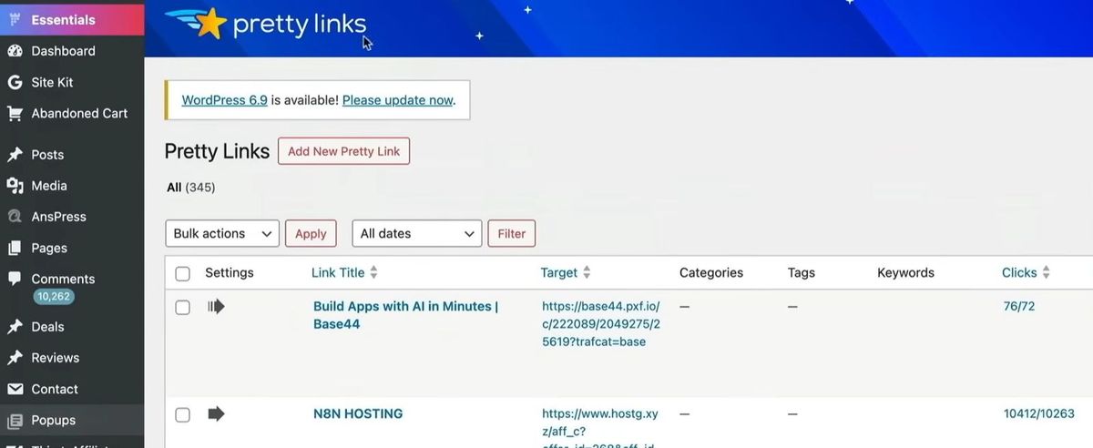 直接把原始的推广链接发在TikTok或者YouTube上,但看起来一点也不专业,我建议你装一个联盟链接追踪工具。我现在用的是 Pretty Links(一个Wordpress插件),还有Thirsty Affiliates等其他工具可以选,我用的是WordPress建站。