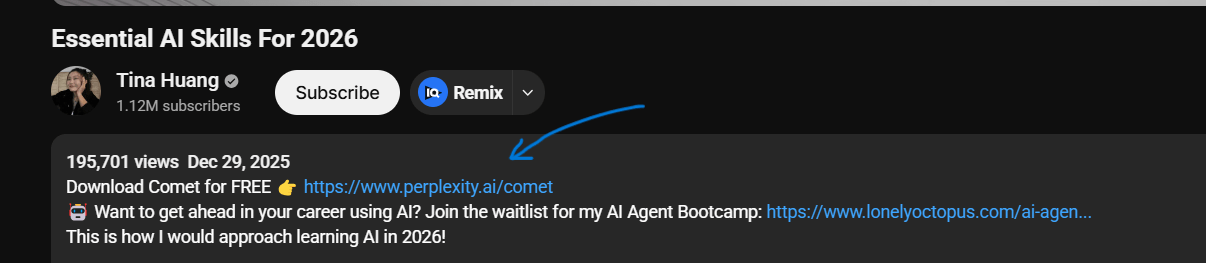 Youtube 就是一个很好的推广渠道,你只要搜索关键词:Comet,或者浏览关于AI的内容,可能就会刷到很多这样的视频,比如Youtube中的推荐,案例视频讲:2026年必备的人工智能技能,第一个推荐的就是Comet浏览器,十几万人次的观看,按照转化率2%,就有4000次下载安装,一个视频收入就能达到几万美元。