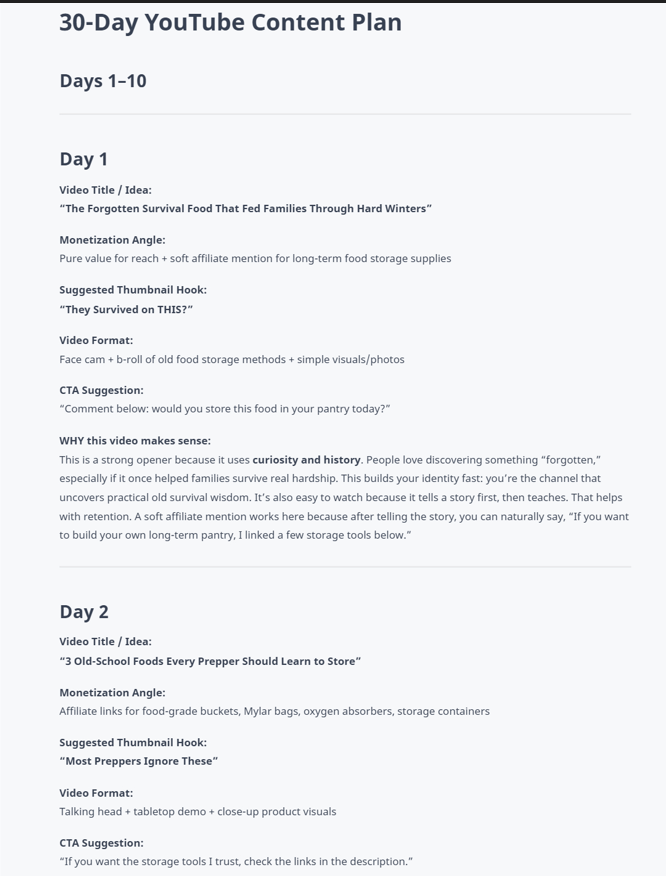这也是为什么,一个真正有价值的YouTube提示词,不应该只是给你30个视频标题。它更应该像一个懂增长、懂转化、懂变现的内容顾问,先帮你理清方向,再帮你生成一套能执行、能增长、还能服务于收入的内容计划。